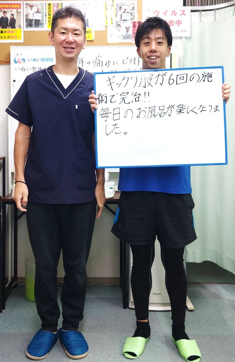 A.私はいぬい整骨院で坐骨神経痛の治療を受けています。左股関節から膝下まで強いシビレと重いだるさと痛みで毎日寝る事が出来ず夜の来るのが怖い位でした。